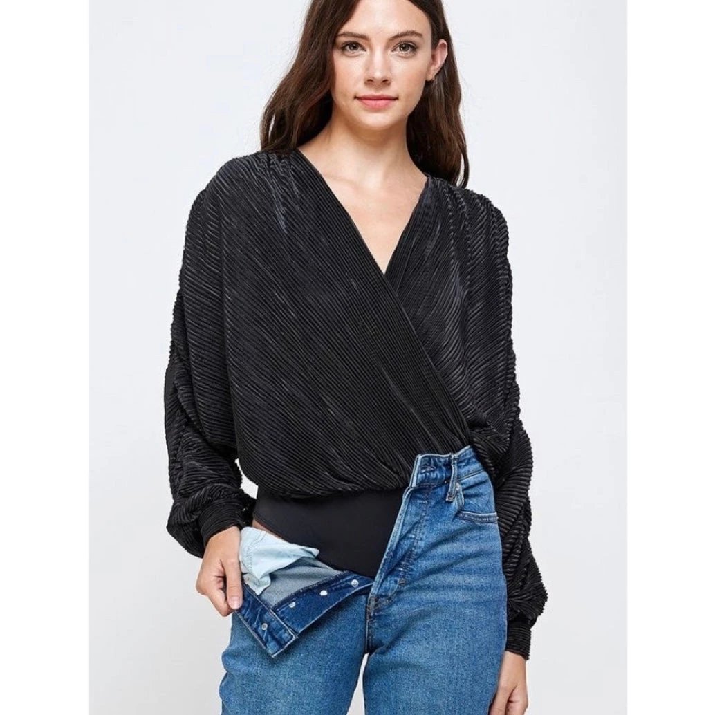 Description: Shirred wrap bodysuit in pleated fabric. This style features adjustable rushed balloon sleeves with buttoned cuffs, a V-surplice neckline, and snap closure at bottom.