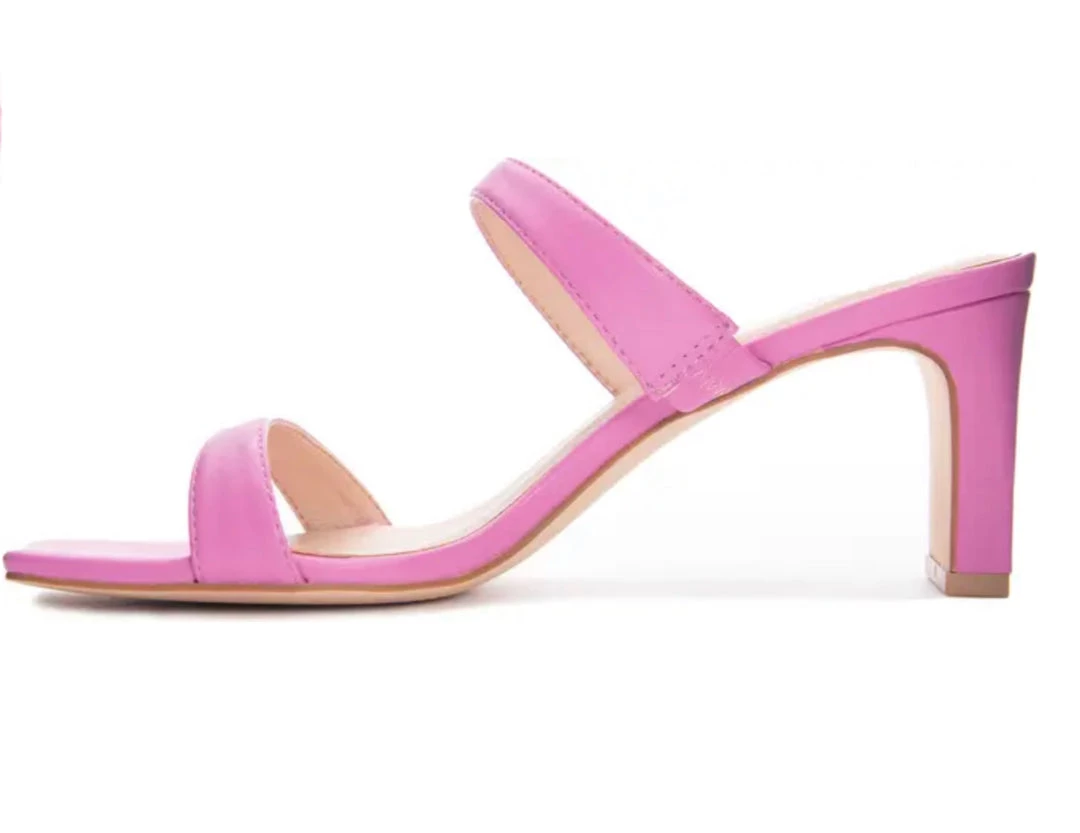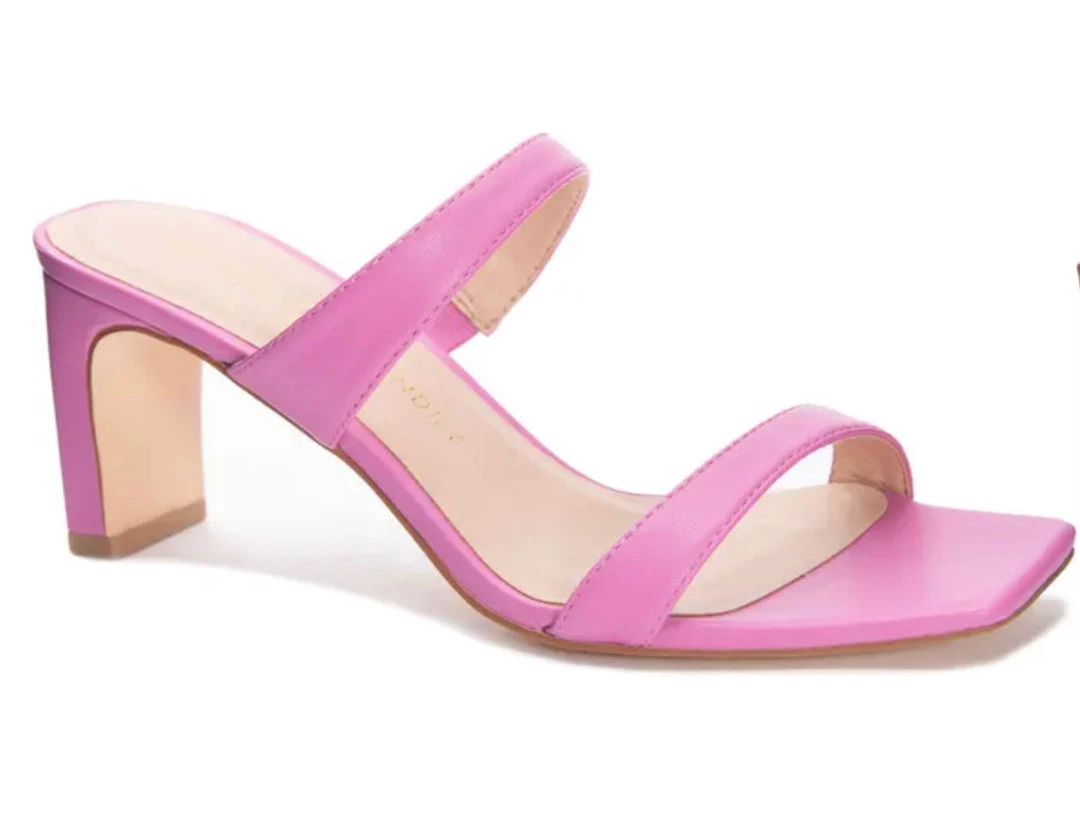 A glossy finish and asymmetric toe strap amp up the contemporary appeal of a chic sandal framed by a square toe and shaved block heel.