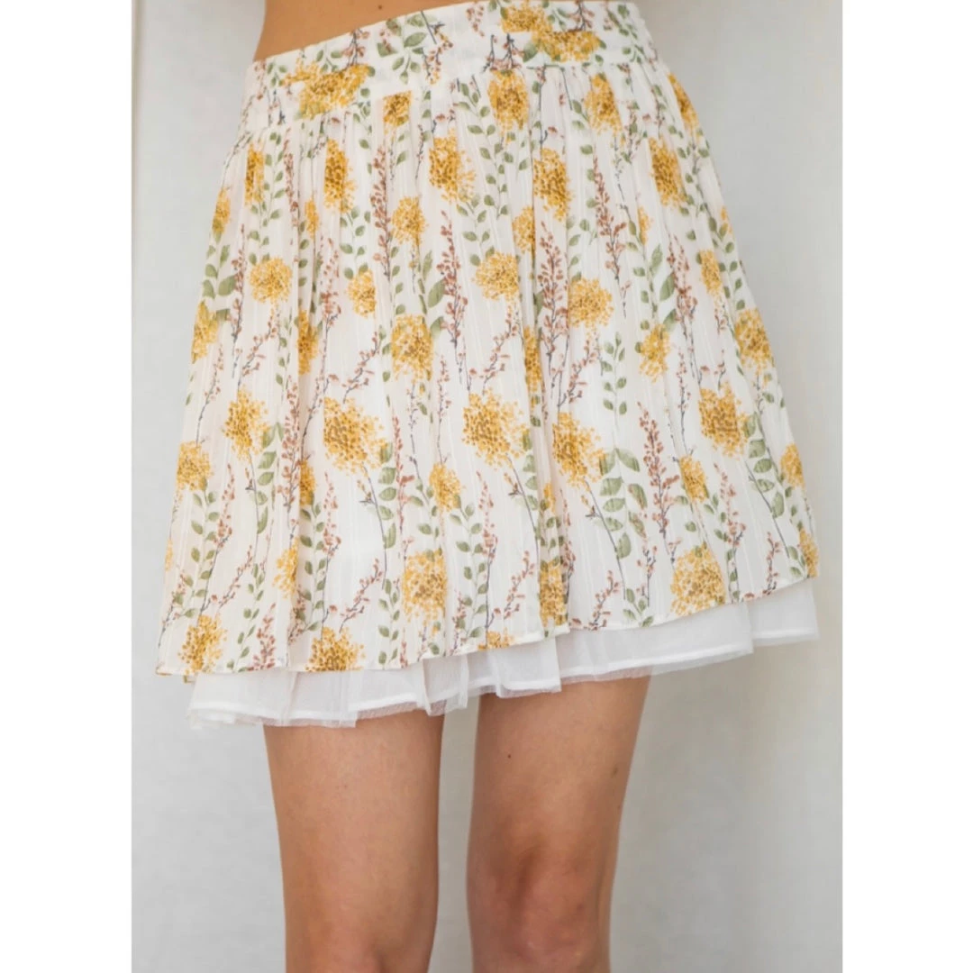 MESH INSERTED VOLUME MINI SKIRT WITH FLORAL CHIFFON